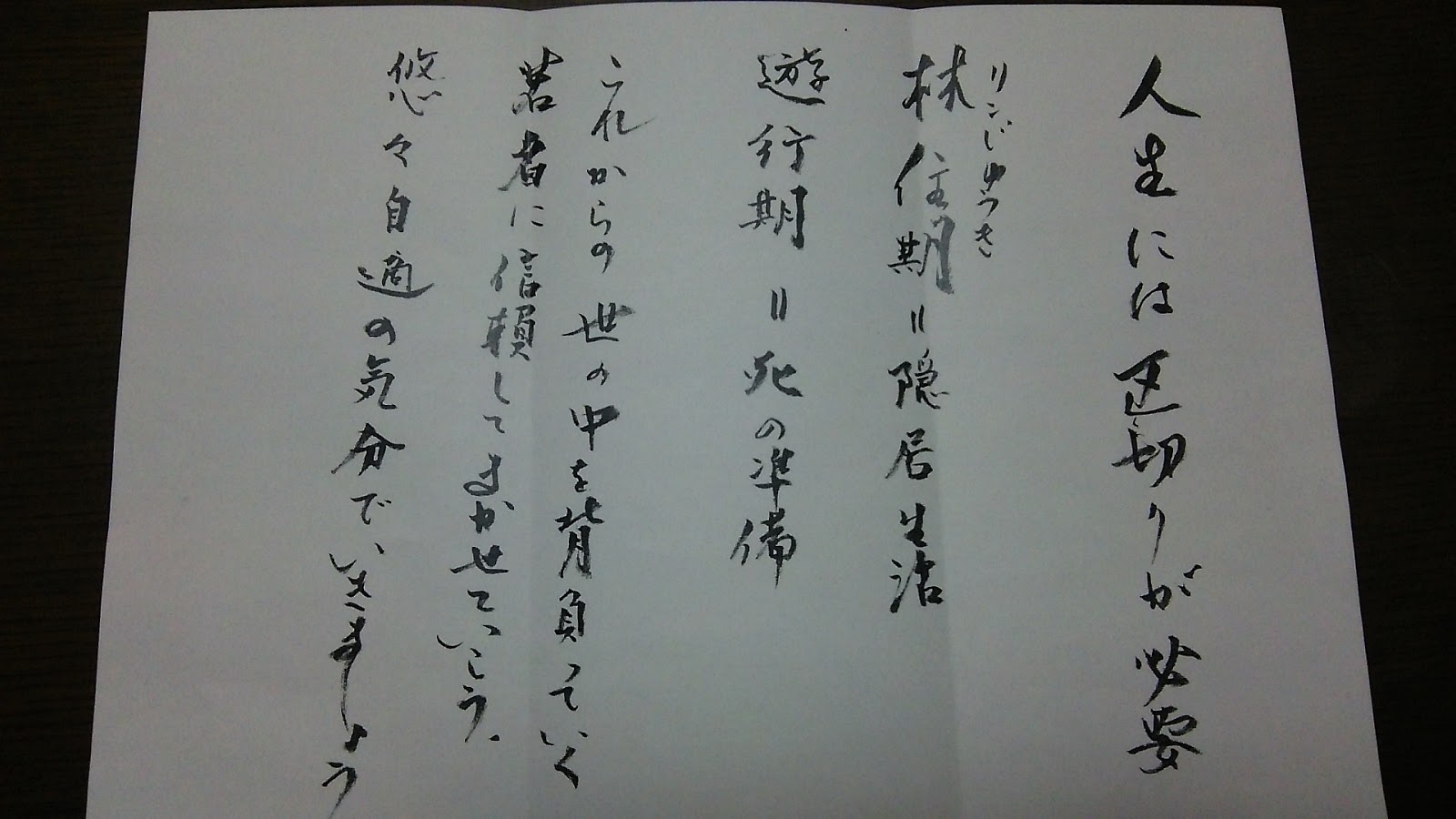 これから先、自分が死んでも世の中が続くが、どういう意向で生きるかの心の用意をして生きていく、今の世はその区切りの時代だという事です。そのことが「曠然自適(こうねん じてき」です。